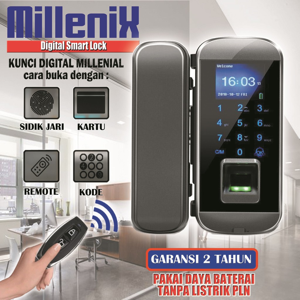 Millenix adalah merk Kunci Pintu Digital Smart millenial masa kini yang terbuat dari material berkualitas dengan daya tahan dan sistem keamanan yang sangat tinggi.Semua produk dibuat dengan cermat dan sangat presisi serta melalui quality control ketat yang mengadopsi standard kunci International.KUNCI DIGITAL MILLENIX PINTU KACAModel: MX- 110Garansi Resmi 2 TahunReady warna : BLACKSPESIFIKASI :Display : TFT 1.77 inch color screenUunlock Mode : Fingerprint , password , Card , Remote (opsional)User Capacity : 1,000 userSupport : U disk self-service download Excel attendance report, and employee informationFingerprint Sensor : Capacitance Fingerprint SensorHousing: Metal-proof ABS housingRecognition speed : less 0.5SLanguage selection : EnglishEmergency power supply: SupportSuitable Door Thiness : 8 -12mmPower Supply : 4pcs Battery AA (tidak termasuk)Memakai daya Baterai, tidak perlu listrik PLNOperating Temperature-20~ 50 CKami menyediakan jasa pemasangan berbayar utk area Jakarta & sekitar nya, utk pemesanan bisa di klik di link : https://shopee.co.id/product/24767032/3808679026/Untuk penambahan kartu bisa di beli di link : https://shopee.co.id/product/24767032/2644889144/Visit us :PT. MilleniX Digilock Perkasa Mangga Dua Square Lantai 2 Blok A PO26Jl. Gunung Sahari Raya No. 01Jakarta Utara 14420 - Indonesia.Tel : (021)6120*680WA CS : 08578*999*9999Jam operasional :Senin - Jum'at Jam 11 - 17. 00Sabtu Jam 11 - 15.00Minggu dan Libur Nasional - Tutup.Cara pemasangan :https://www.youtube.com/watch?v=NkKrPw