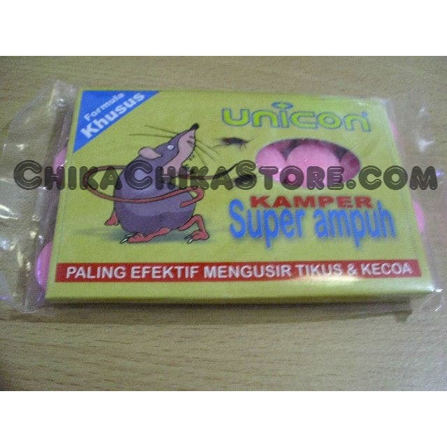 KAMPER SUPER AMPUH PALING EFEKTIF MENGUSIR TIKUS & KECOA Merek : Unicon / Barus / setaraNetto : 40 gram Kamper atau kapur barus (naphthalene ball) pada umumnya digunakan untuk menghilangkan bau tak sedap dalam lemari pakaian, kamar mandi, dan tempat lain.Akan tetapi kamper yang satu ini beda dengan kamper jenis lainnya....!!!KINI TELAH LAHIR PRODUKSI TERBARU KAMPER SUPER AMPUH PALING EFEKTIF MENGUSIR TIKUS & KECOA.Kamper Super Ampuh ini dapat digunakan pada :- dibawah mesin cuci / kulkas- dibawah lemari buku / lemari makanan- gudang di atas flafon rumah- sarang tikus / kecoa- dibawah kamar tidurDIJAMIN 100% KEAMPUHANNYA !!!!!!!!Hati - hati produk ini mengandung NAPHTHALENE 99,9%PERHATIAN :1. Hindarkan dari jangkauan anak-anak2. Hindarkan kontak langsung dengan makanan3. Ccilah tangan setelah menggunakan KAMPER SUPER AMPUH4. Simpan KAMPER SUPER AMPUH ditempat yang kering5. Satu bungkus KAMPER SUPER AMPUH untuk pemakaian 2 meter6. Penggunaan bisa di rumah, hotel, restaurant, toko / supermarket, rumah sakit dll*KAMPER SUPER AMPUH tidak membuat tikus mati di tempat a