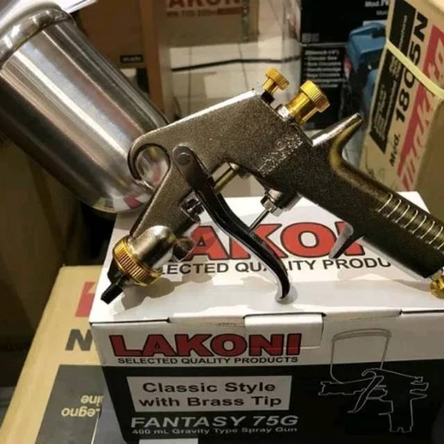 Spray GunBrand : LakoniTipe : Fantasy 75G Tabung AtasSistem Feeder : Suction (Hisap)Lebar Pengecatan : 150 - 200 mmPenggunaan Cat : 160 - 200 ml/menitPenggunaan Udara : 2 - 6 scfmPenggunaan Tekanan :3.5 bar / 0.35 MpaUkuran Tengki : 400 mlBahan Nozzle & Tip :