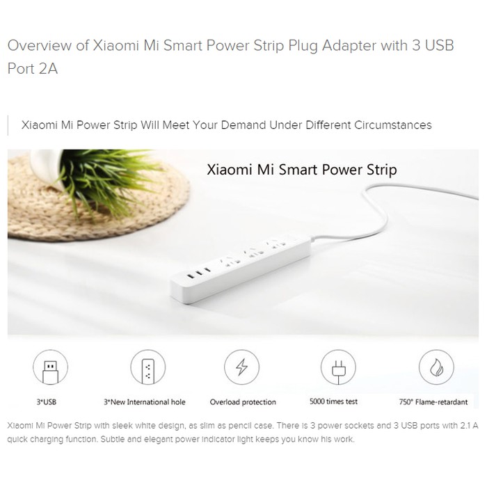 [ORIGINAL] Xiaomi Mi Smart Power Strip Plug Adapter with 3 USB Port 2AAvailable :Putih & HitamNote : 1. Garansi 1 Bulan2. Ready Stock 3. Mohon konfirmasi stock dulu sebelum melakukan pemesanan 4. Pengiriman ( Maksimal H + 1 ) Spesifikasi :DimensionProduct Length : full-length 1.8mSize : 22.5cm x 4.1cm x 2.6cmOthers Overload protection : 10ARated input : 10A,250VRated output : 10A,250VRated power : 2500WUSB module input : 100-240V, 50/60Hz,0.5AUSB module output : single USB,5V---2.1A(TYP) Three USB, 5V 3.1A (TYP)Use of the environment temperature : -10C - 40CFlame retardant : 750 CSafety resistance : 75NSupport 2A fast charger 3 USB Charging PortsYour versatile and original charger, auto power distribution by smart chips, support mobile, tablets, etc. Electrical Security On The Basis Of Quality MateialsQuality phospor bronze, integrated copper strip processing for enhanced safety.Trouble Free UseBlackout timely when overloading, prevent fire from short circuit. Joemex, a company with 20 years circuit breaker designing experience.Happy Shopping :) barang tersedia boss , langsung dipesan , akan segera kami p