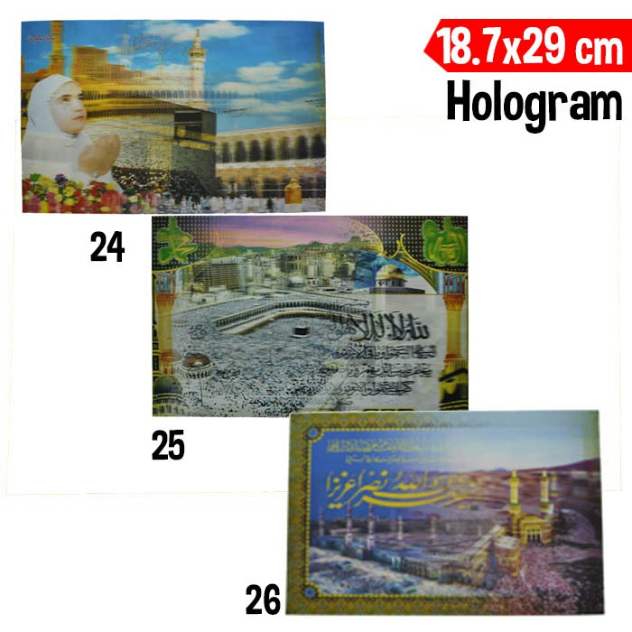 Kaligrafi lembaran berbahan sejenis plastik hologram yang mengkilap dan tebal. Memiliki keunikan karena gambar berubah sesuai dengan sudut pandang mata.Terdapat 3 pilihan gambar- Ayat Kursi- Masjid Nabawi- K