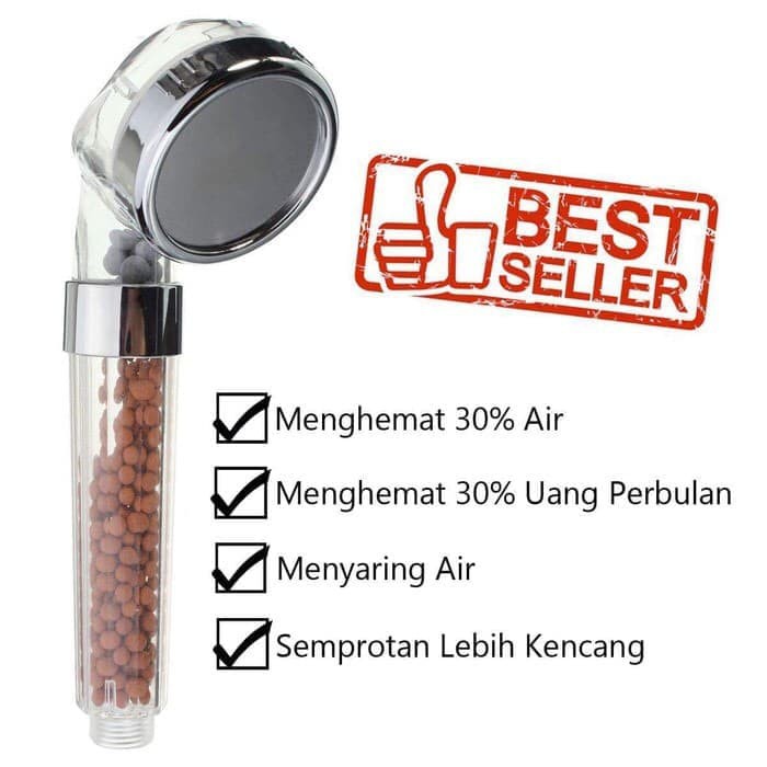 Kondisi air di beberapa wilayah terbilang kurang bersih sehingga dapat menyebabkan iritasi ataupun gatal-gatal pada kulit. Untuk itu Ion Shower Head hadir untuk Anda yang ingin mandi dengan air yang terjamin kebersihannya. Ion Shower Head memiliki butiran-butiran penyaring pada gagangnya sehingga air yang mengalir akan tersaring dan menghasilkan air yang lebih bersih. Banyak kegunaan yang bisa didapat dari ion shower ini seperti membantu mencegah rambut rontok dan mengurangi klorin penyebab ketombe, serta Deodorise (menghilangkan bau kurang sedap), Hemat air sampe 40% dan menjernihkan air.*Diameter : 8cm *3 Motif Pengeluaran Air*Bahan : Plastik & ABS*Kepala shower dapat dibuka untuk dibersihkan kembali apabila kotor*Semprotan lebih kencang dan halus dari pada kepala shower biasaEX : SEBELUM PEMAKAIAN ION SHOWER HEAD , TAGIHAN AIR DIRUMAH MAUPUN DIAPARTMEN SETIAP BULAN MECAPAI 200 300 RIBU ATAUPUN LEBIH , TETAPI SETELAH MENGGANTIKAN SHOWER HEAD ION PADA KAMAR MANDI , TAGIHAN BIAYA BULAN BERIKUTNYA BERKURANG SAMPAI 30%-40% , SETELAH DIHITUNG DENGAN PEMAKAIAN ION SHOWER HEAD SELAMA 1 BULAN SUDAH BISA MENUTUPI MODAL PEMBELIAN 1 PCS ION HEAD SHOWER , DAN SETERUSNYA SETIAP BULAN SUDAH BISA MENGHEMAT UANG AIR !!!Menjernihkan air dengan menggunakan 2 macam bola keramik nano:Brawn Ball (bola keramik sinar infrared)Mengeluarkan residu klorin dalam air,logam berat,kotoran dan oksidan,baik untuk membuat dan menjaga rambut dan kulit lebih sehat ,serta melancarkan peredaran darah.Black Ball (bola keramik germanium)dapat memberikan off mikro saat ini dan efek far infrared,melepaskan ion negatif,mempertahankan PH air tetap bagus,membuat air menjadi sedikit basa dan memberikan nilai tambah bagi kesehatan manusia barang tersedia boss , langsung dipesan , akan segera kami p