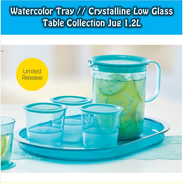 Table Collection Jug & Watercolor Tray & Crystalline Low Glass (Gelas, Nampan & Teko) TupwrTable Collection Jug 1,2L (1 Pcs)Ukuran : 1.2 L // d: 13.3 cm; t: 16 cmFitur Table Collection Jug 1.2 L :1.Terdapat lekukan ergonomis yang ditampilkan dalam desain yang modern, juga sebagai pegangan saat menuang minuman agar tidak licin.2.Terdapat lubang penuang berbentuk agak runcing, minuman keluar dengan baik dan tidak tercecer.3.Cover yang dapat diatur sehingga tidak mudah tumpah saat ingin dituang4.Cover juga dapat digunakan sebagai wadah kue5.Terbuat dari bahan PC sehingga tidak mudah terkena nodaWatercolor Tray (1 Pcs)Ukuran : 38.7 x 25 x 3 cmKeistimewaan :•Memiliki warna turquoise yang serasi dengan koleksi Classy Crystalline.•Terbuat dari bahan PC sehingga tidak mudah pecah•Handle yang ergonomis sehingga memudahkan saat membawa nampan berisi minumanCrystalline Low Glass (4 Pcs)Ukuran : @230 ml/ 7.9 x 7.9 x 6.4 cmTak hanya tampilan serta bentuknya yang mewah, Crystalline Low Glass (4) juga dilengkapi dengan aneka fitur istimewa, diantaranya:1.Dilengkapi cover, menjaga minuman tetap higienis.2.Terdapat lekukan pada bagian bawah base untuk memberikan kenyamanan Anda saat memegangnya.3.Pada bagian bawah base juga terdapat ulir sehingga tidak akan mudah tergelincir saat dipegang.4.Dapat disimpan secara bertumpuk sehingga menghemat tempat penyimpanan.5.Terbuat dari bahan PC yang kuat, sangat elegan dan aman untuk menghangatkan minuman dalam microwave.6.Ukurannya pas untuk menyajikan minuman sehat untuk keluarga.7.Produk ini mudah dibersihkan dan aman dari noda sisa minumanNB : MOHON TANYAKAN KETERSEDIAAN BARANG TERLEBIH DA