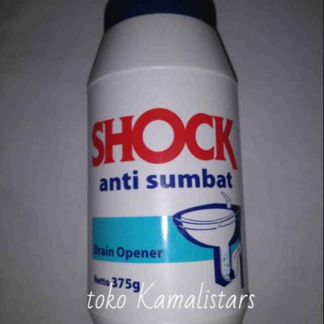 SHOCK melancarkan saluran pembuangan air yang tersumbat. Menghancurkan rambut ,benang, lemak, sisa makanan dll.Aman untuk jenis pipa saluran PVC dan septik tank.Aturan pakai Mencegah saluran tersumbat :1. Tuangkan 2-3 sendok makan SHOCK ke dalam saluran pembuangan air. Isi saluran dengan 1/2 gelas air (100-150ml). Diamkan 10-15 menit kemudian alirkan air yang deras ke dalam saluran air.2. Lakukan setiap minggu agar saluran pembuangan air lancar dan terhindar dari sumbatan.Untuk Saluran Tersumbat:1.Keringkan dahulu wastafel dari air yang menggenang.2.Tuangkan 4-6 sendok makan SHOCK ke dalam saluran. Isi saluran dengan 1/2 gelas air (100-150ml). Biarkan 10-15 menit kemudian alirkan air yang deras ke dalam saluran air.3.Ulangi aturan pakai bila saluran masih tersu