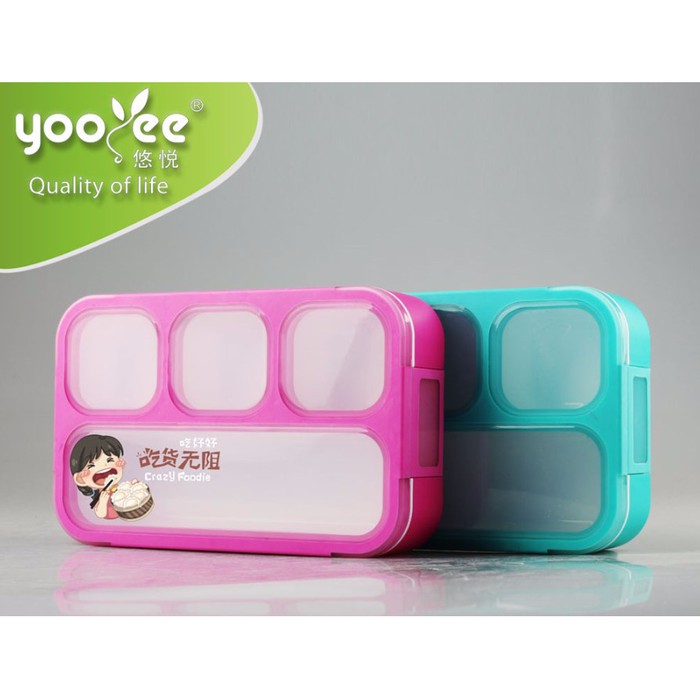 605 Lunch Box Kotak Makan Yooyee bento kotak bekal untuk anak-anak 4sekatyooyee original 100 %Readypinkbiru tosca- 100% brand new- Food Grade PP BPA Free- Ukuran 18 x 11,5 x 6 cm - Kapasitas 540ml- Ditutupnya terdapat karet antar sekat, sehingga makanan tidak bercampur- Bahan plastik tebal BPA Free- Tahan panas sampai 120c- Dilengkapi sendokKelebihan:1. Terbuat dari bahan yang berkualitas untuk makanan, aman dan tidak membahayakan2. Tidak berbau plastik bahkan menggunakan air mendidih di dalamnya3. Bahan berkualitas yang tahan terhadap panas atau dingin4. Dapat digunakan untuk pemasanan menggunakan microwave, menyimpan pada kulkas, dan mesin cuci piring (Dishwasher)5. Tahan panas sampai