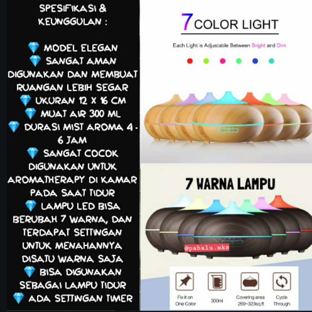 Youngliving versi murah ini ya. Kualitas bisa diadu harga sangat sangat bersahabat order now!!Cara Penggunaan :- Buka penutup diffuser- Tuangkan air putih pada diffuser (bisa air minum atau air putih biasa)- Tuangkan beberapa tetes aroma diffuser kedalam diffuser yang sudah berisi air tadi- Tutup penutup diffuser- Tekan tombol ONSPESIFIKASI : Model elegan cocok diletakkan diruang tamu Sangat aman digunakan dan membuat ruangan lebih segar Ukuran 12 x 16 cm 300 ml Durasi mist aroma 4 - 6 jam Sangat cocok digunakan untuk aromatherapy di kamar pada saat tidur Lampu LED bisa berubah 7 WarnaISI PAKET : Diffuser Aroma 1 pcs Tempat takaran air 1 pcs Kabel colokan diffuser Box Diffuser Aromathe