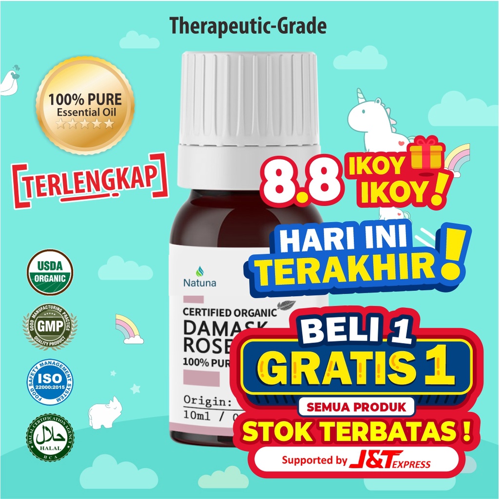 Shopee 8.8 Ikoy IkoyHARI INI TERAKHIRBELI 1 GRATIS 1 Semua Produk( u/ Produk yang Bertanda Khusus B1G1 )Stock Sangat Terbatas~===================Natuna Damask Rose Essential Oil=============================Size: 10mlCode: N012378Type: Pure Essential OilGrade: Therapeutic-gradeCertified: OrganicOrigin: BulgariaLatin Name: Rosa Damascena=============================Damask Rose Essential Oil for Skin HealthIn 2010, Chinese researchers published a study uncovering that rose oil exhibited one of the strongest bactericidal activities compared to 10 other oils. They also discovered that just after five minutes of a 0.25 percent dilution, Propionibacterium acnes (the bacteria responsible for acne) was completely destroyed!How to use rose oil for acne: If you suffer from acne, try dabbing one drop of pure rose essential oil on blemishes three times a day. Make sure you use a sterile cotton swab; if the antimicrobial power is too much for you, dilute it slightly with some coconut oil.Another reason to use rose essential oil for skin health is because of its uncanny ability to increase your skin’s permeability!As German scientists explained in a 2010 article, one of the most intriguing aspects of rose essential oil is that, “For substances applied in rose oil, a clear relationship between their lipophilic character, chemical structure, and skin permeation could be confirmed.”Essentially, what this means is that when rose is added to your beauty and skin products, it opens up your skin to absorb more of the chemicals and nutrients.Used to your advantage, this can be quite life-changing if you mix your own products and include only the best ingredients. On the other hand, if your products are filled with harmful ingredients, even if the manufacturer includes rose oil (as many do), you may be unknowingly exposing yourself to toxic chemicals!Beberapa Tips Cara Pemakaian : Diteteskan 2-10 tetes pada Diffuser sebagai Terapi u/ memberikan efek rileksasi & mendapatkan manfaat dari Essential Oil. Dicampur dgn Natuna Carrier Oil, Oleskan pada leher & pijat u/ manfaat ketika diluar rumah atau ruangan. Diteteskan Random / Acak disudut2 rumah / apartmen untuk menghilangkan bau tak sedap secara instant.===============Natuna Essential adalah Brand Lokal u/ Essential Oil dgn Standard International ( ISO ) & Therapeutic Grade dgn Variant Essential oil TERLENGKAP di indonesia.*FREE BUBBLE WRAP, BOX AND LOVE DARI NATUNA ESSENTIAL Lᵒᵛᵉᵧₒᵤ♥#EssentialOil#Aromatherapy#Therapeuticgrade#DamaskroseEssential #Diffu